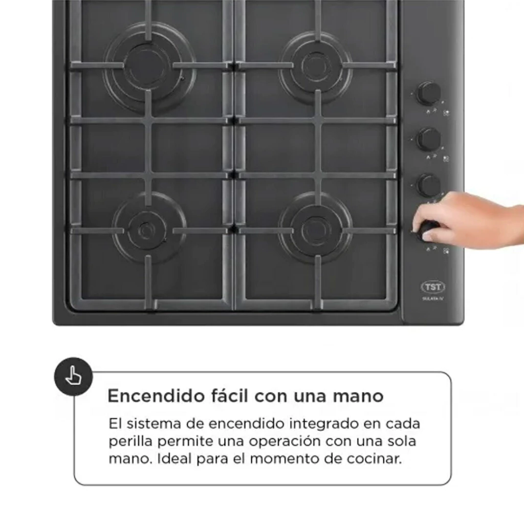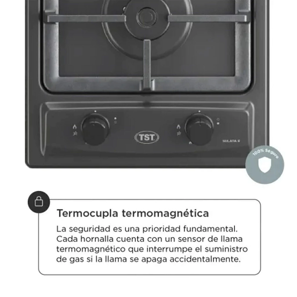 La Sulata Neo 2 de TST es una anafe de 2 hornallas ideal para espacios reducidos o como complemento en cocinas modernas. Cuenta con dos quemadores de alta eficiencia, encendido electrónico a una mano y rejillas de fundición esmaltadas, que aseguran estabilidad y durabilidad. Su acabado en gris grafito le da un estilo sobrio y elegante. Equipada con válvula de seguridad (termocupla termomagnética), es apta para gas natural o licuado (multigas) e incluye kit de transformación. Compacta pero completa: potencia, diseño y seguridad en un solo equipo.