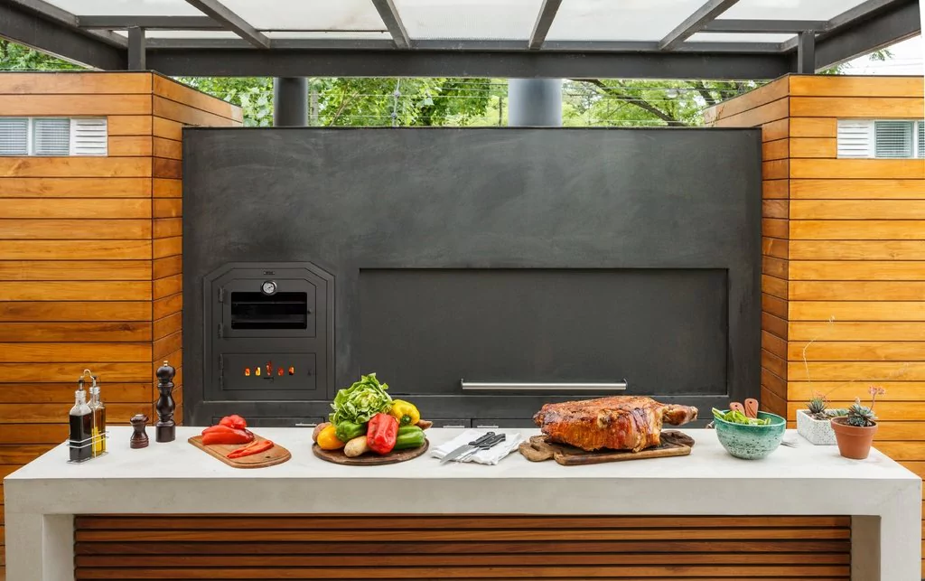 Horno a leña de calor envolvente. En la cámara de combustión de refractarios se quema la leña y sus gases los cuales chocan con el deflector y se dirijen hacia los laterales y luego hacia el techo por donde sale por la chimenea, de esta forma envuelve el calor al horno interno el cual esta enlozado y tiene una salida de vapor de cocción, viene con dos parrillas y una asadera. Viene en tres versiones, para embutir, con y sin carro.