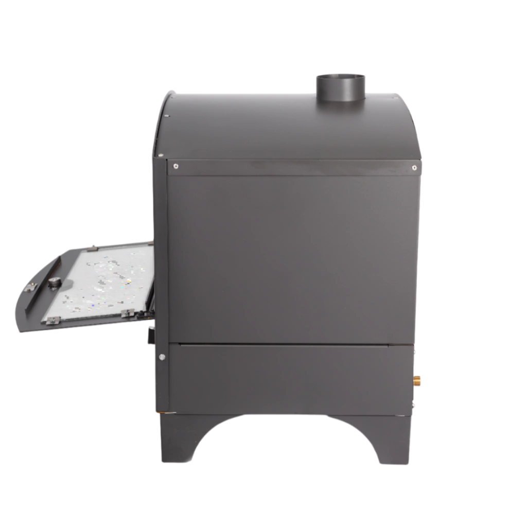 Modalidad: dos niveles, tres alturas de cocción, interior acero inoxidable, parrilla cromada, base de ladrillos refractarios y multigas